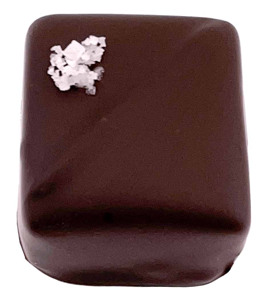 Salted Caramel Dark chocolate coated chewy caramel topped with infused vanilla sea salt. Dark chocolate coverage. Dietary notes: Contains dairy, soy lecithin in chocolate.