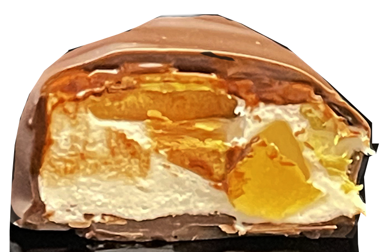 Blood Orange Blood orange dark chocolate ganache with vanilla sable cookie base. Milk chocolate coverage. Seasonal. Dietary notes: Contains gluten, dairy, soy lecithin in chocolate.