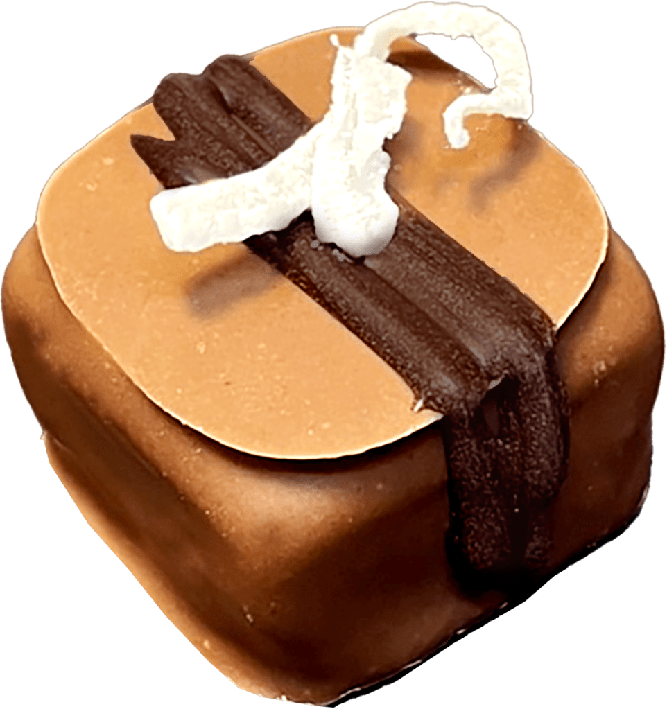 Passion Fruit Coconut Coconut filling layered with ganache made with passion fruit chocolate by Valrhona. Dark chocolate coating Dietary notes: Contains dairy, soy lecithin in chocolate.