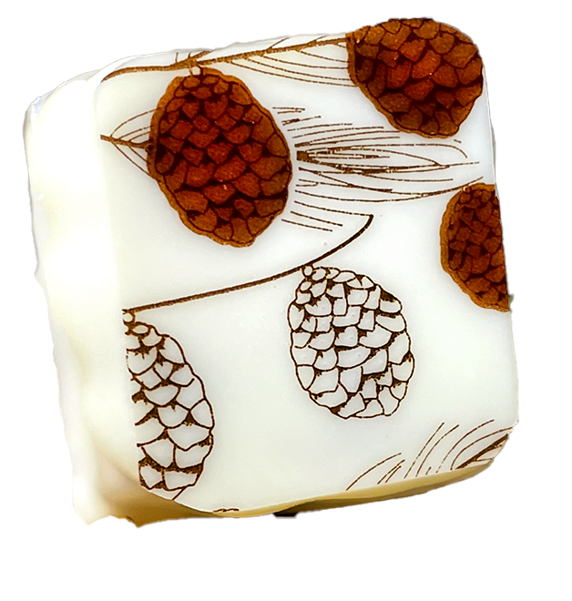Pine Forest Pine nut caramel with a layer of pine needle tea ganache. Dipped in dark chocolate. Taste like the forest! Dietary notes: Milk, Soy, Tree Nut (Pinenut)